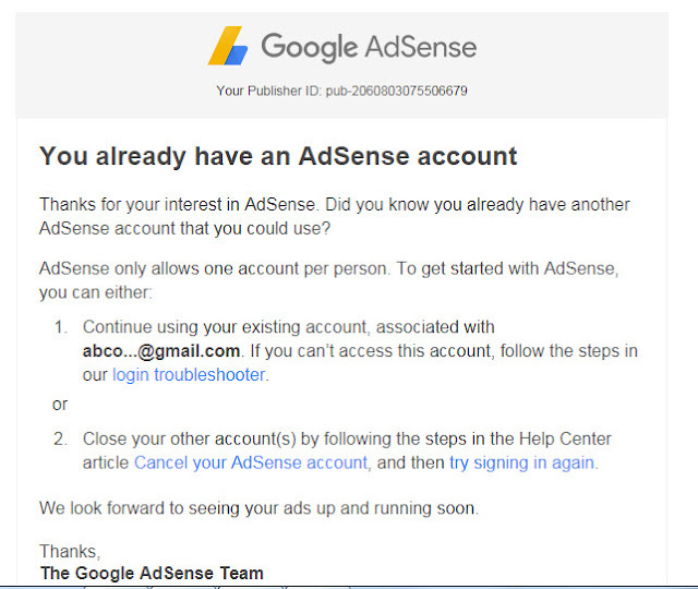 My active Google adsense account has been suspended. and google send me an email like this – You already have an AdSense account. How can I resolve this problem? Please help.